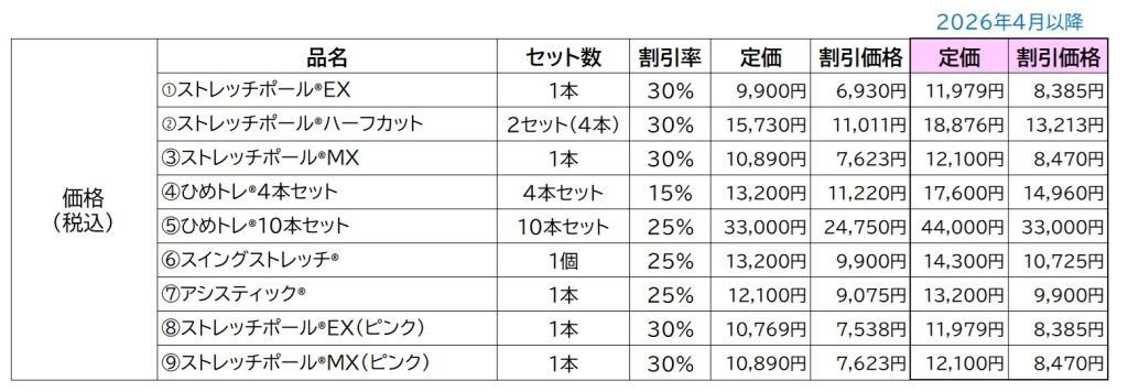 StretchPole®のLPN社さんより、昨今の材料費・運送費・人件費等の高騰により、現行価格の維持が困難な状況となっていることから、製品の安定供給およびサービス向上を目的とした価格改定